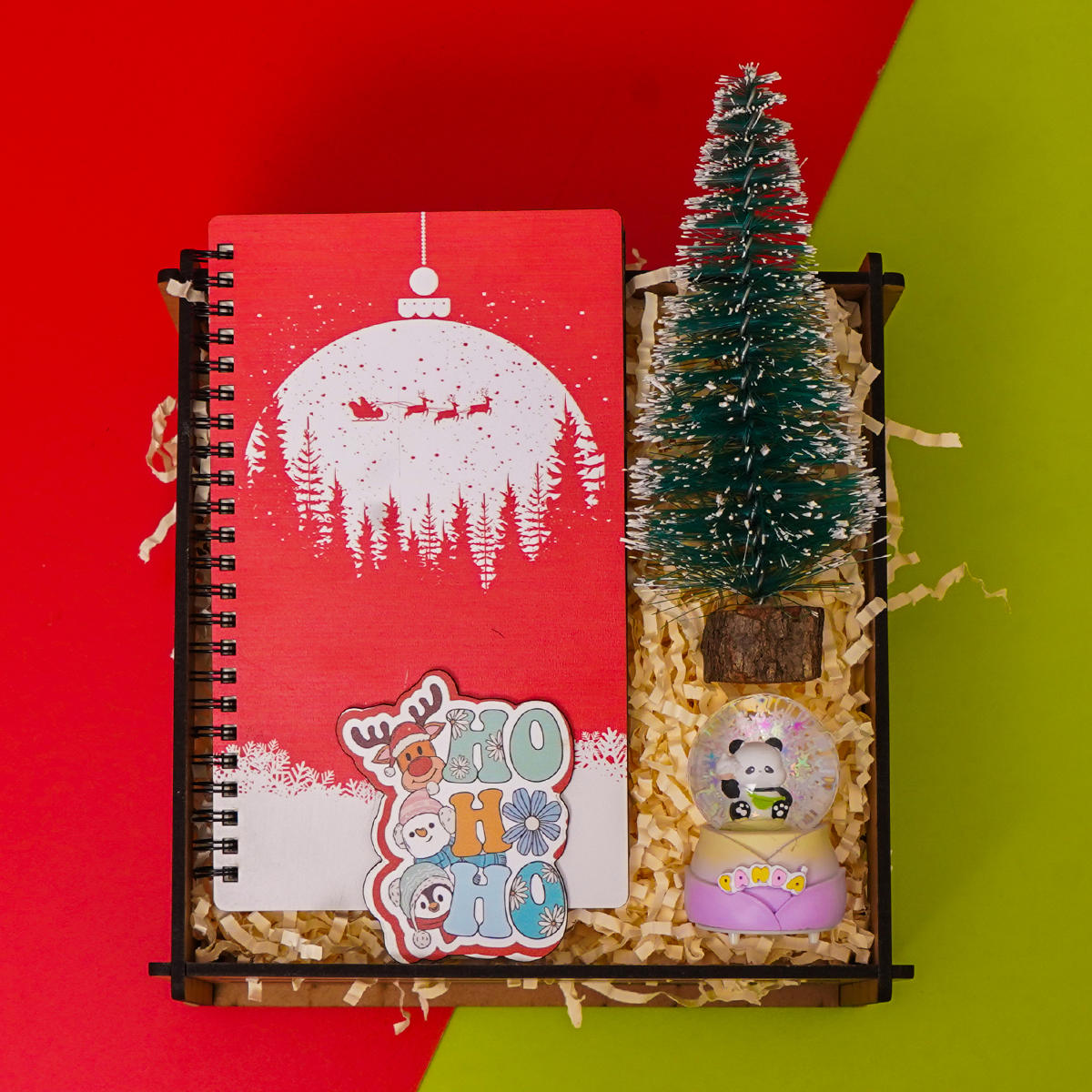 ÜRÜN İÇERİĞİ; Devamlı kullanılabilir ahşap hediye kutusu, Ahşap kapaklı defter, Kar küresi Magnet Çam ağacı 17cm Ek görselde temsili paketleme ve süsleme örneği gösterilmektedir.