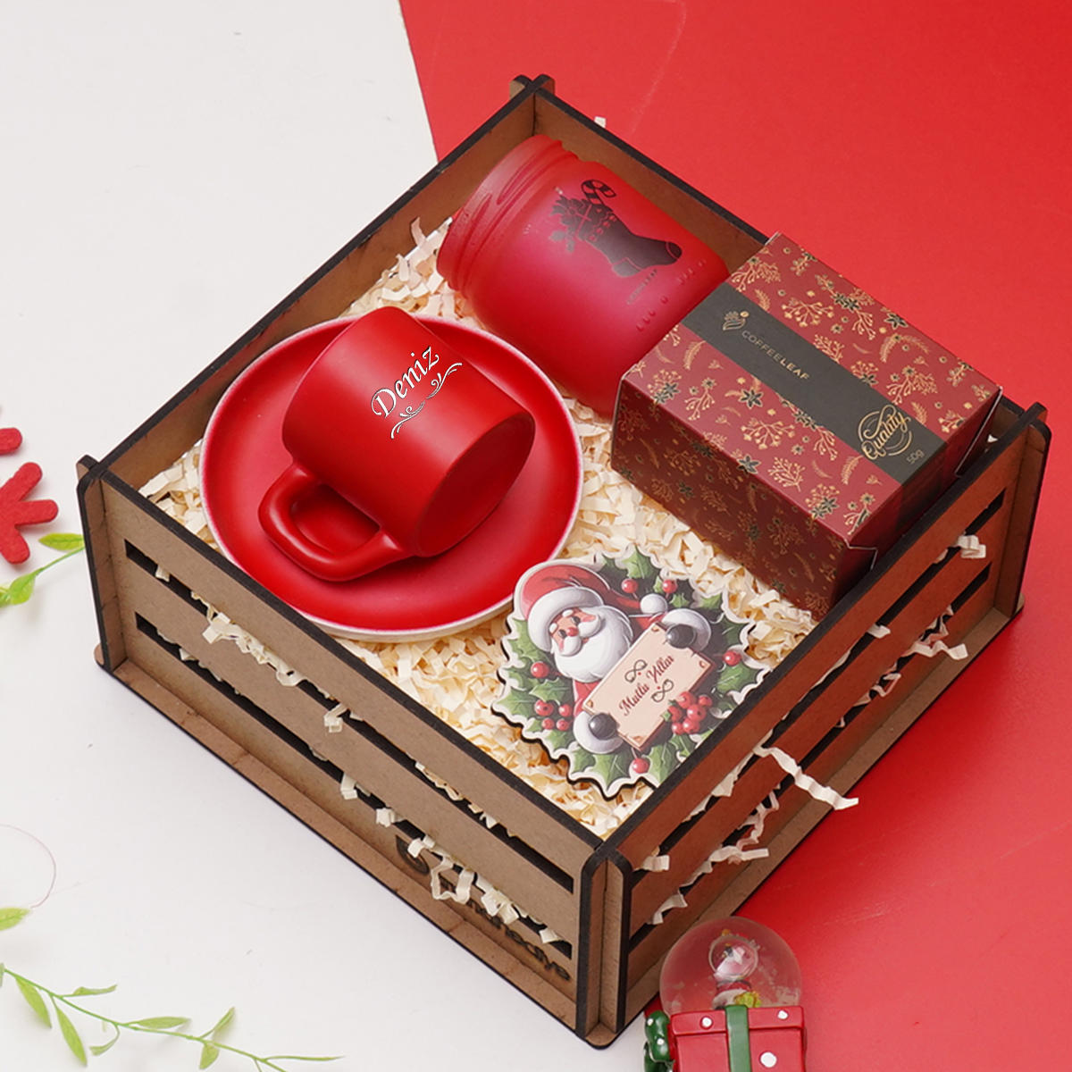 ÜRÜN İÇERİĞİ; Devamlı kullanılabilir ahşap hediye kutusu, Kişiye özel Seraclass 100ml Kahve Fincan Takımı Kokulu cam mum, Magnet Ek görselde temsili paketleme ve süsleme örneği gösterilmektedir.