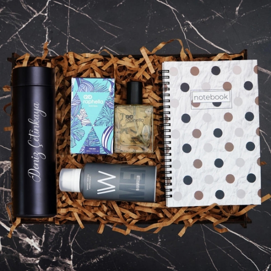 -Devamlı Kullanabileceğiniz Ahşap Özel Harfli Büyük Kutu -Dijital Dereceli Çelik Termos -Sert Kapaklı Spiralli Defter -Raphella Erkek Parfüm -Kişiye Özel Termos