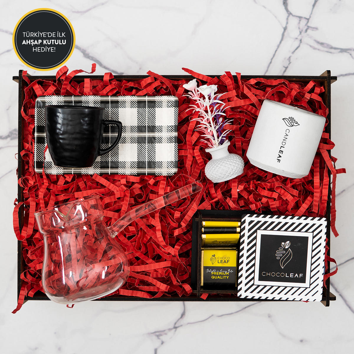 Cam Cezve , Kahve Fincanı, Çikolata, Mum, Masa Çiçeği, Hediye Kutusu