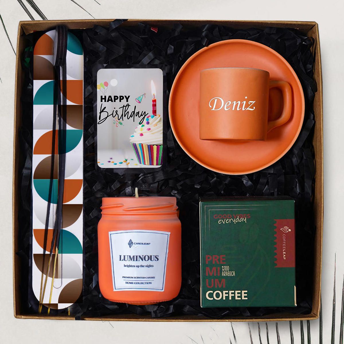 Sevdiklerinizin doğum gününü unutulmaz kılmak için tasarlanan bu özel hediye seti, hem şık hem de anlamlı bir sürpriz sunar. Kişiye özel baskılı renkli fincan ile kahve keyfi kişisel bir dokunuş kazanırken, kokulu cam mum ve tütsü huzurlu bir atmosfer oluşturur.