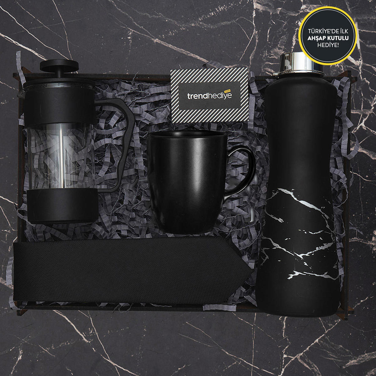 -AHŞAP Devamlı Kullanacağınız Kişiye Özel Büyük Kutu -Siyah Frenchpress - Siyah Kupa -Cam Gümüş Mermer Desenli Suluk -Erkek Kravat