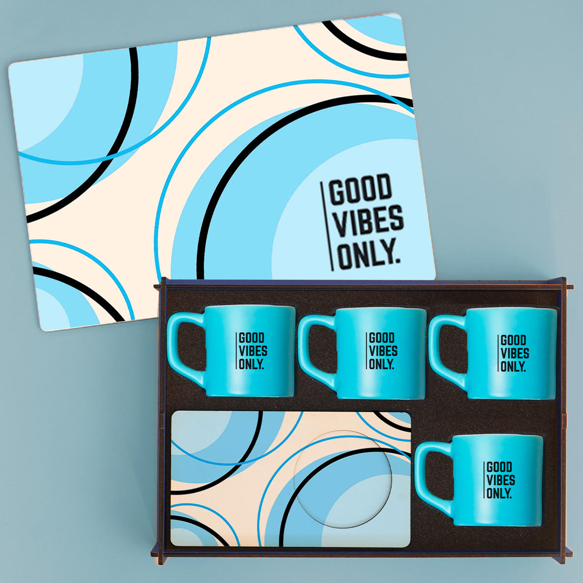 Good Vibes Only. Tasarımlı Sürekli Kullanılabilir Ahşap Kutuda 4’lü Türk Kahvesi Fincan Takımı