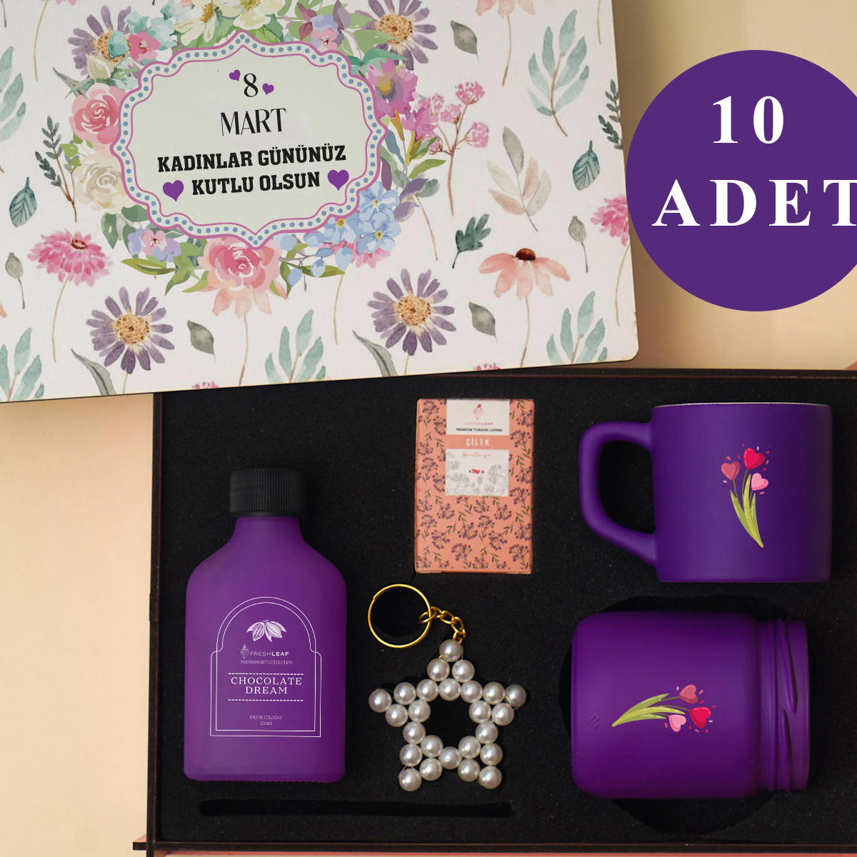 Kadınlar Günü’ne özel 10’lu avantajlı hediye seti, zarif ve kullanışlı ürünleri bir araya getirerek sevdiklerinizi mutlu etmenin en şık yolunu sunar. Kurumsal toplu alımlar ve özel gün sürprizleri için ideal, anlamlı ve ekonomik bir hediye seçeneğidir.Görselde yer alan ürünler 10 adet olarak, her biri ayrı kutulanmış şekilde toplu gönderilmektedir.