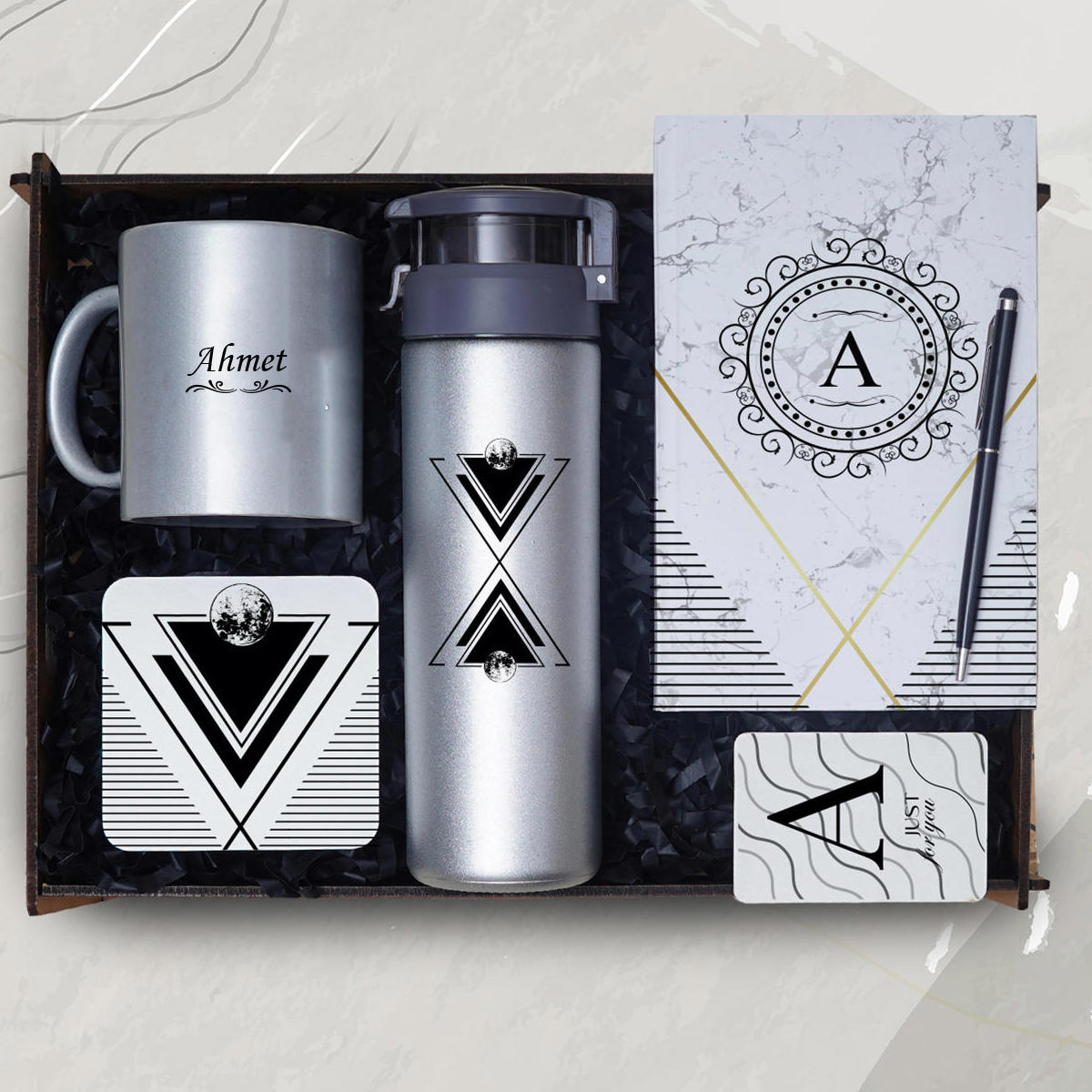 - Gümüş İsme Özel Kupa Bardak - Gümüş Cam Matara 500ml - Özel Tasarım Kalın Kapaklı Defter -Metal Kalem - Bardak Altı