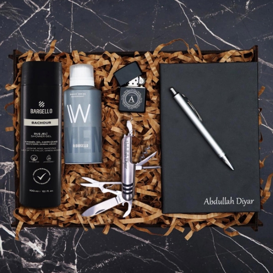-Devamlı Kullanabileceğiniz Ahşap Özel Harfli Büyük Kutu -Kişiye Özel Sert Kapaklı Siyah Defter -Erkek Vücut Spreyi -Erkek Deodorant -Metal Tükenmez Kalem -Kişiye Özel İsveç Çakısı -Kişiye Özel Metal Benzinli Çakmak