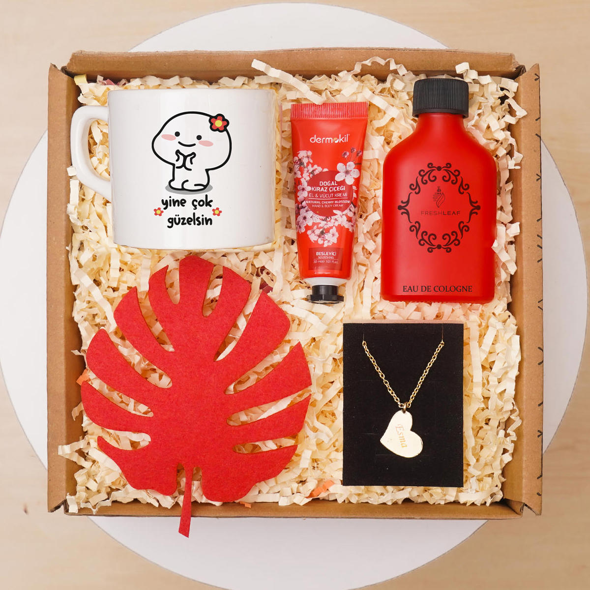 Ürün İçeriği; - Kişiye Özel Kalp Kolye,; -T- Fincan, 220ml, - Keçe Fincan Altlığı - El & Vucut Kremi, - Cam Şişe Kolonya 200ml, -Kişiye Özel Kalp Kolye -