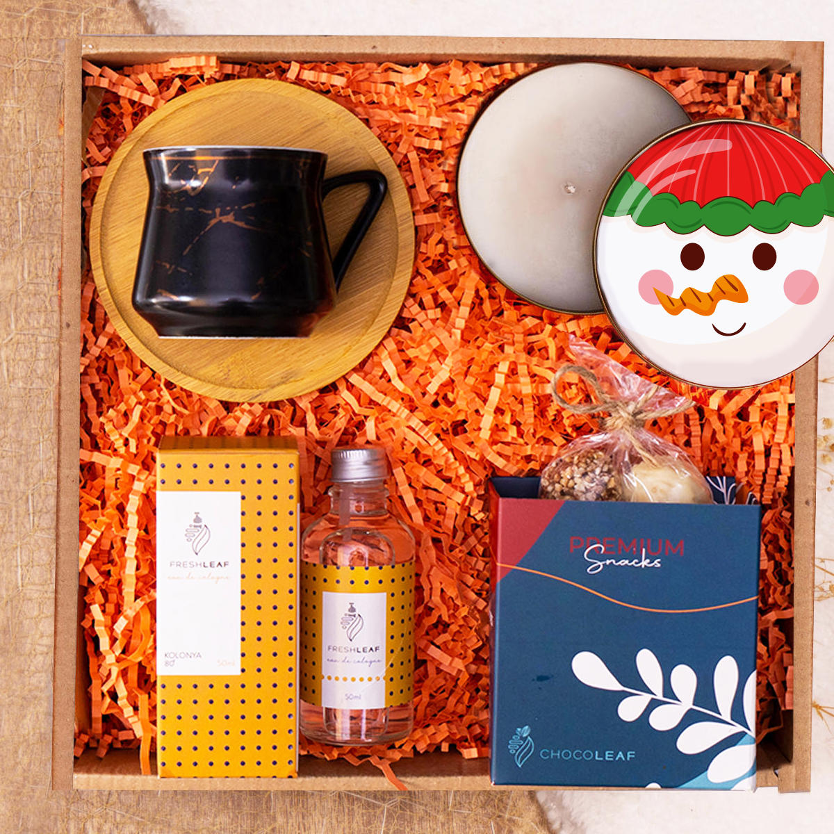 - Hediye Kutusu - Sunumlu Kahve Fincanı - Candleaf Metal Kutulu Mum (Kardan Adam Temalı) - Freshleaf Kolonya 50ml - Chocoleaf Truff Çikolata