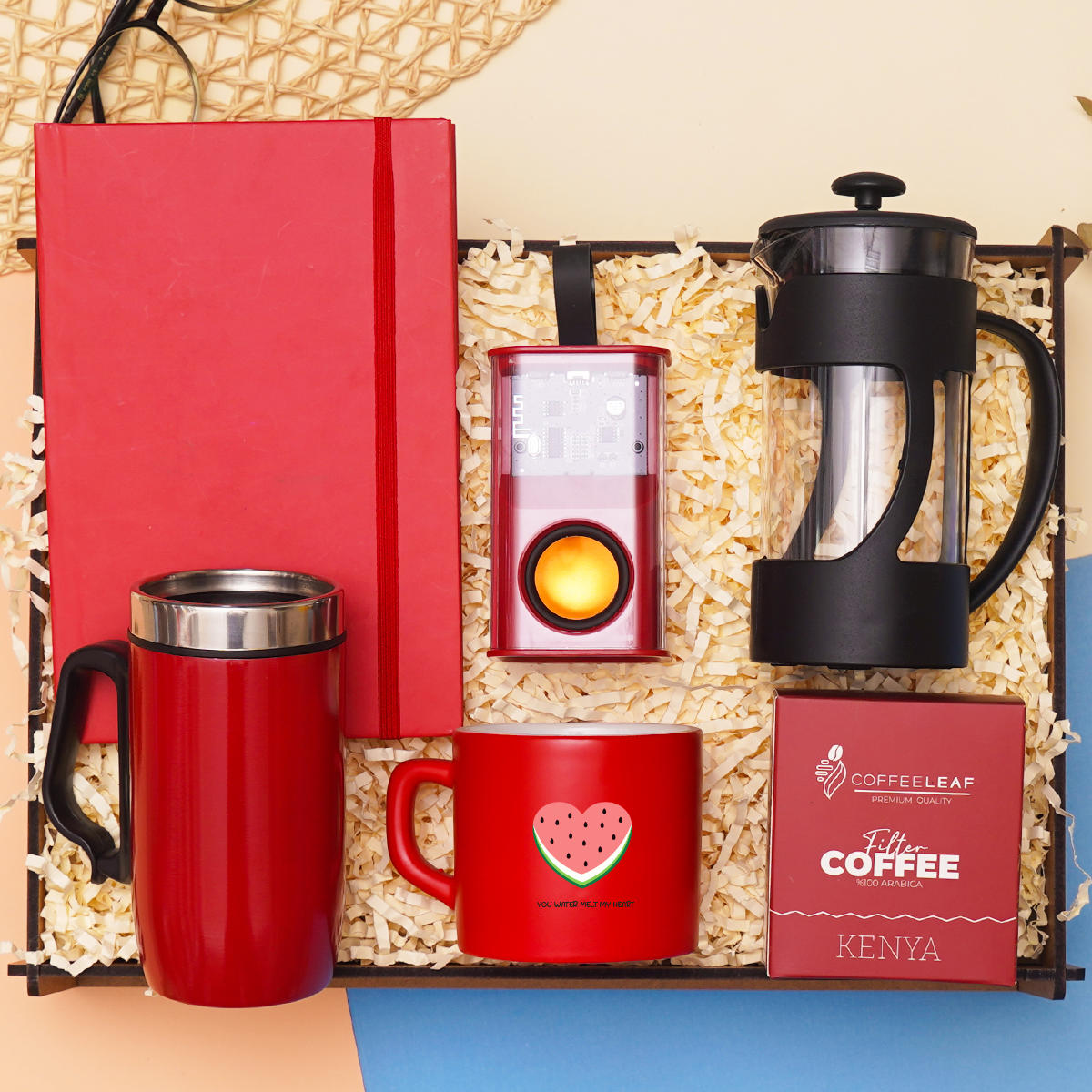Dekoratif ahşap kutu içinde yer alan 350 ml French Press ve 50 gr Coffeleaf filtre kahve ile taze kahve keyfi her an elinizin altında. 350 ml çelik kupa bardak ve klasik kupa bardak kahve sunumunuzu tamamlıyor. RGB ışıklı bluetooth hoparlör ise kahve molalarınızı müzikle renklendiriyor. 80 yapraklı çizgili defter, ilham dolu notlar ve planlamalar için ideal bir eşlikçi sunuyor.