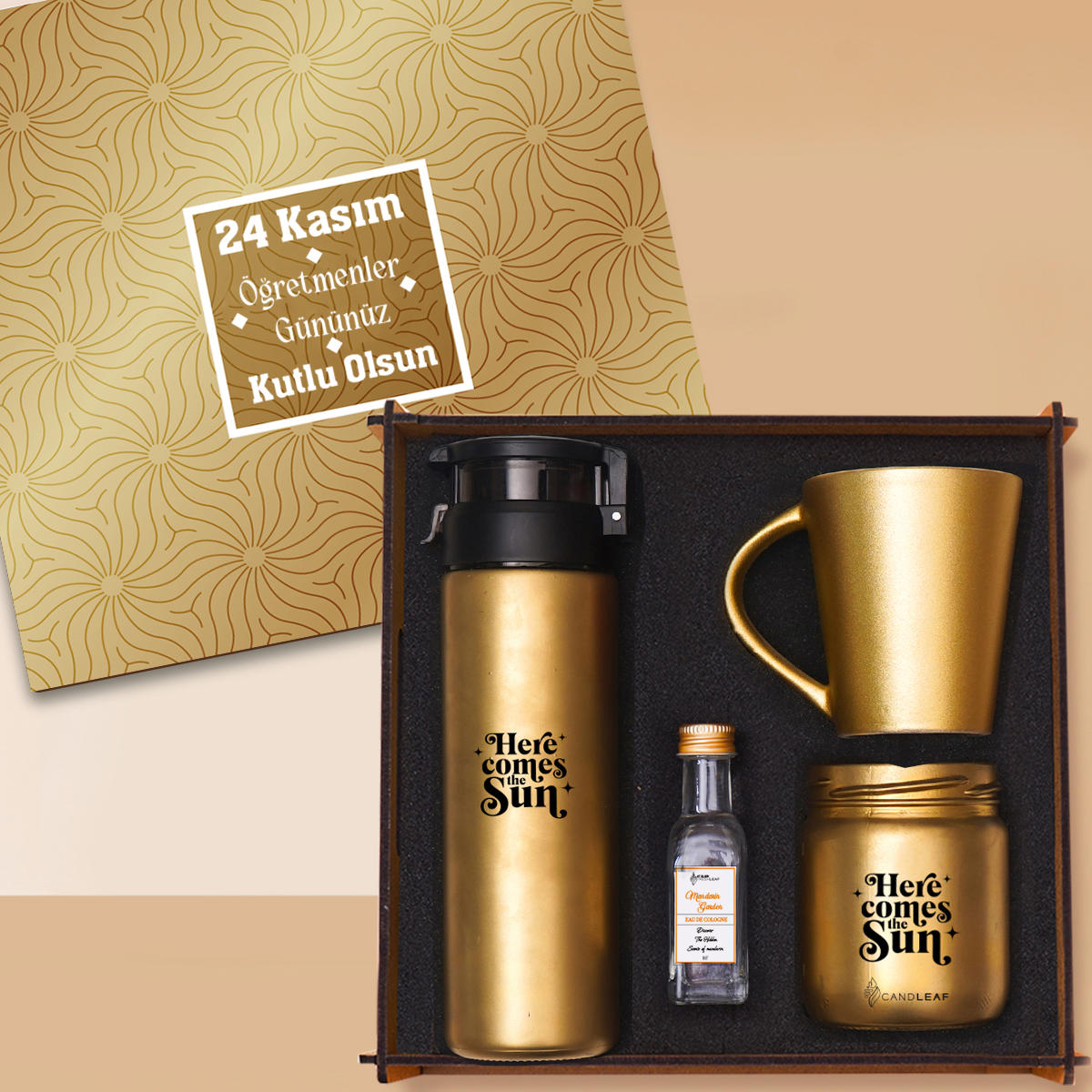 Öğretmene Hediye - Woody Collection Hediye Seti | Cam Suluk, Kupa Bardak, Mum, Kolonya - Gold Renkli