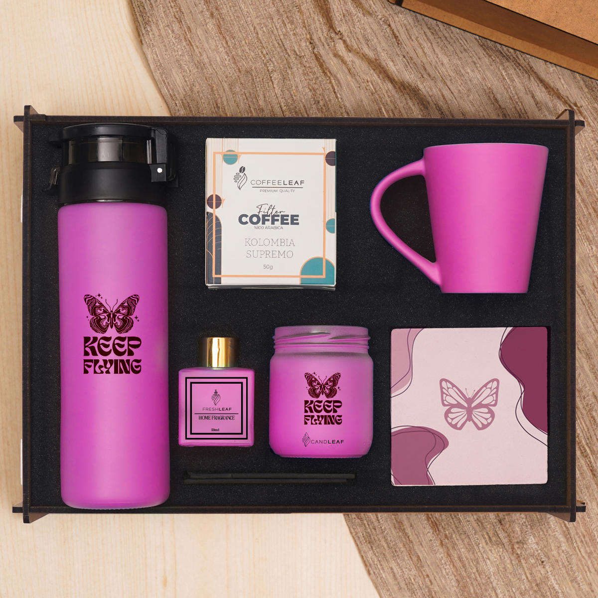 Premium Pembe Hediye Seti - Matara, Ortam Kokusu, Mum, Kupa & Taş Bardak Altlığı, Filtre Kahve