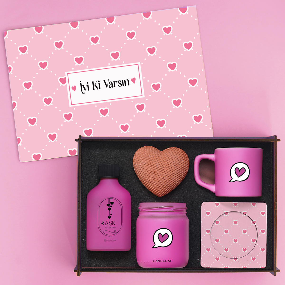 Sevgiliye özel tasarlanan bu romantik hediye seti; dekoratif ahşap kutu içerisinde kolonya, mum, kahve fincanı ve kalp temalı aksesuarlarla şık ve anlamlı bir hediye alternatifi sunar. Sevgililer Günü, doğum günü ve yıldönümü için idealdir.
