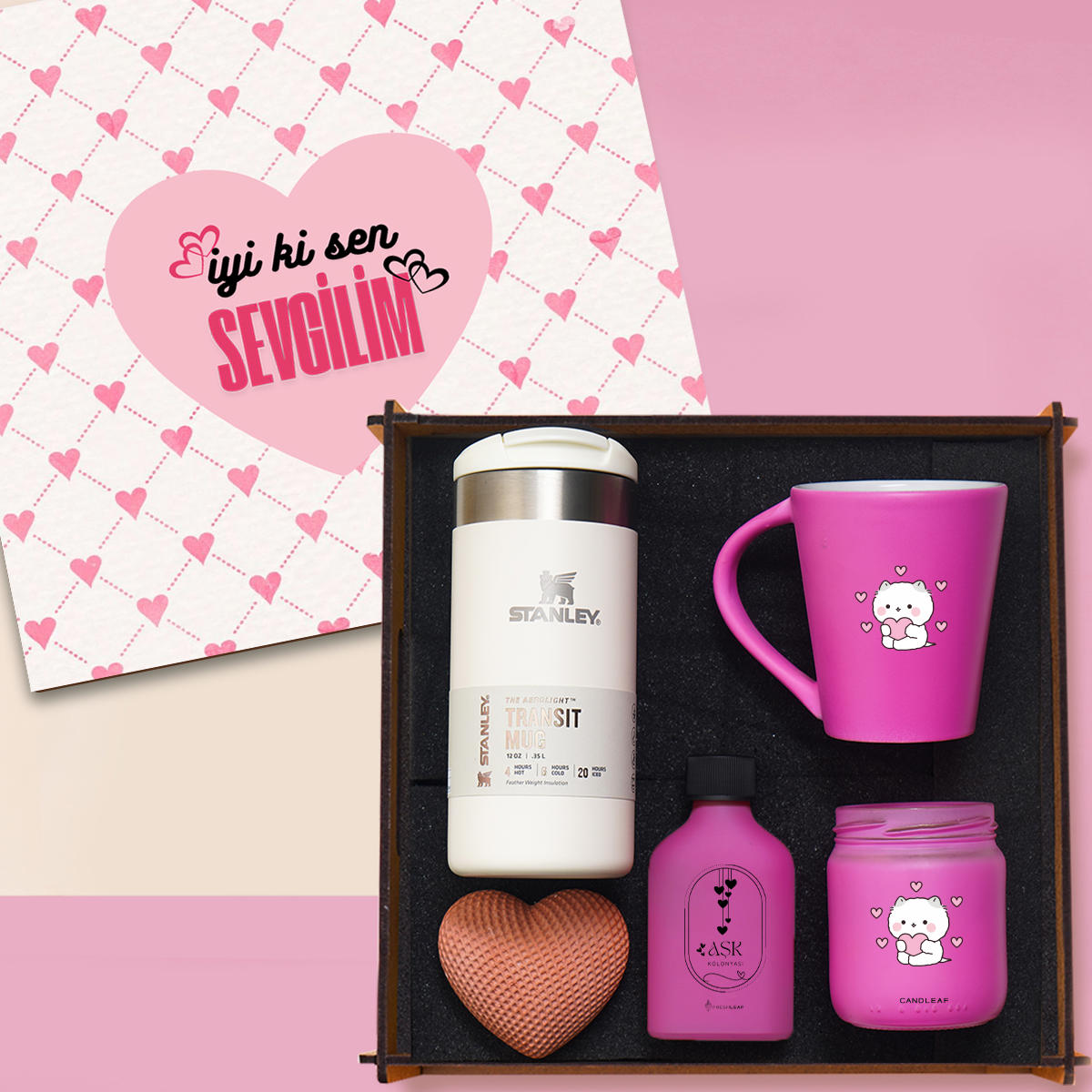 Stanley termos, pembe kupa, kalp biblo, kolonya ve kokulu mumdan oluşan “İyi Ki Sen Sevgilim” temalı şık hediye seti.