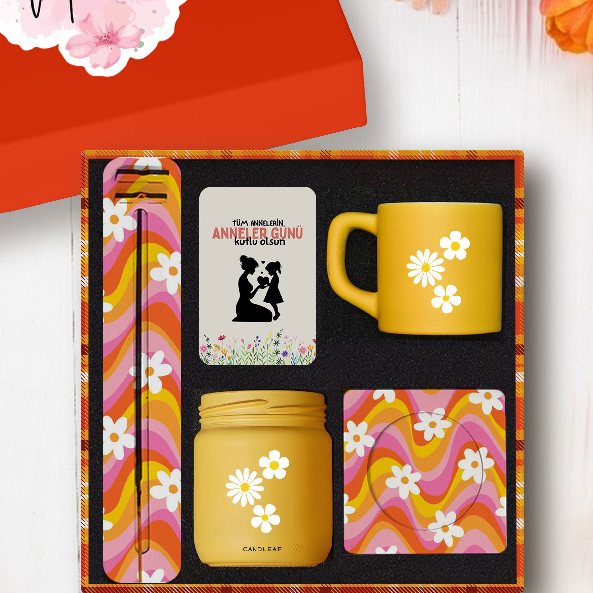 Şık süngerli taslama kutusu ile sunulan bu özel set; kahve keyfini taçlandıran fincan, dekoratif ve kullanışlı ahşap bardak altlığı, ortama hoş koku yayan cam mum ve tütsü seti ile annenize sakin ve keyifli anlar yaşatır. Ayrıca Anneler Günü temalı MDF magnet ile anlamlı bir hatıra sunar.