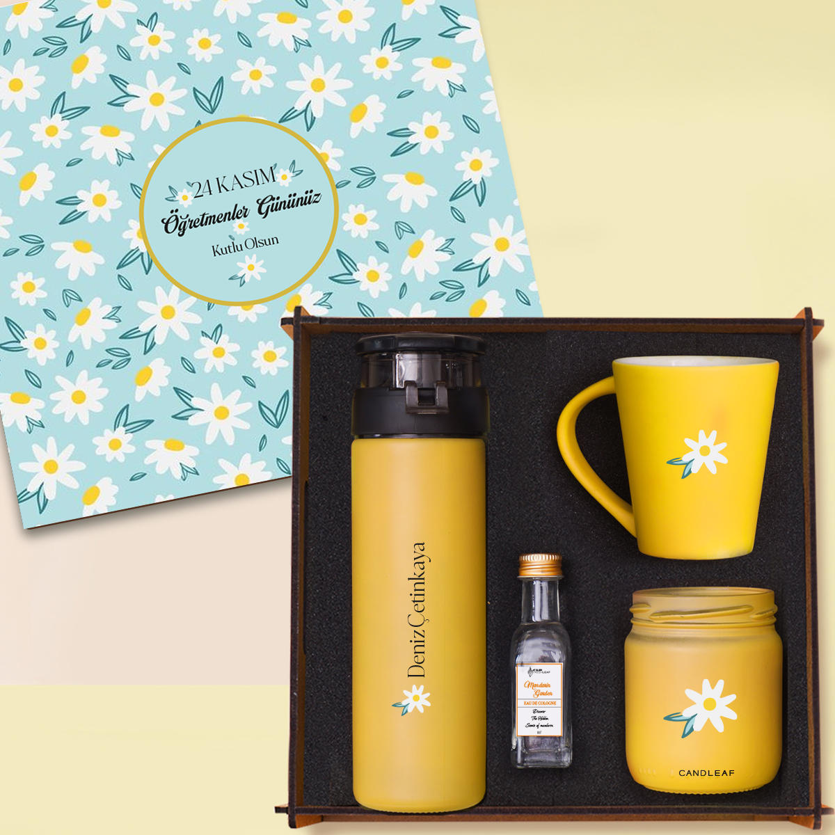 • Woody Collection Öğretmenler Günü Hediye Seti | Cam Suluk, Kupa Bardak, Mum, Kolonya -Sarı