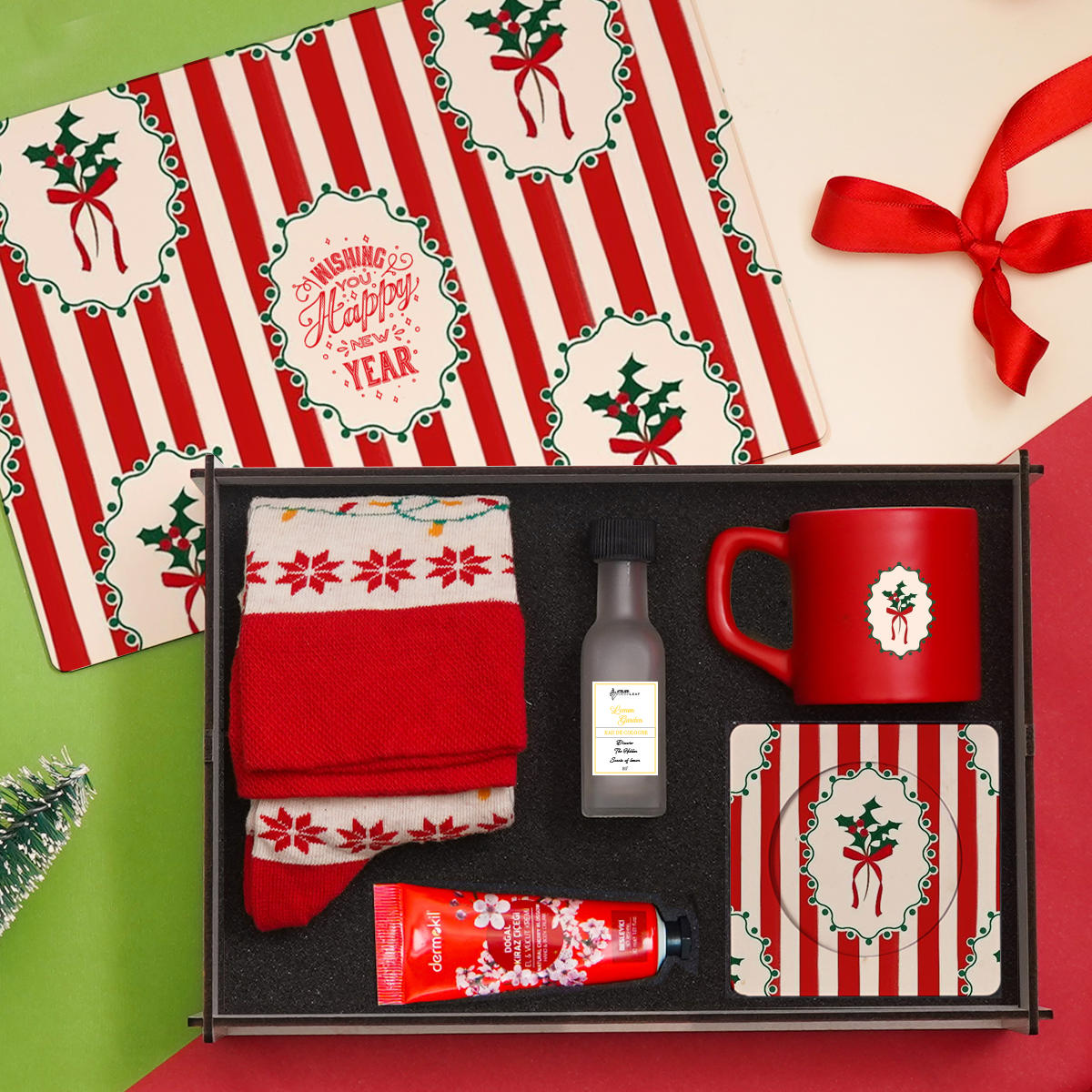 Sürekli kullanılabilir 18x26 cm dekoratif ahşap kutu içerisinde özenle hazırlanmış yılbaşı hediye seti. Hem günlük kullanım hem de yılbaşı hediyesi olarak şık ve kullanışlı bir seçenektir.