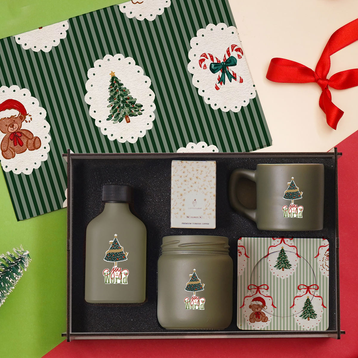 Sürekli kullanılabilir 18x26 cm dekoratif ahşap kutu içerisinde hazırlanmış özel yılbaşı hediye seti. Şık tasarımı, kokulu mum ve kahve temasıyla hem sevdiklerinize hem de kurumsal hediyeler için ideal bir tercihtir.