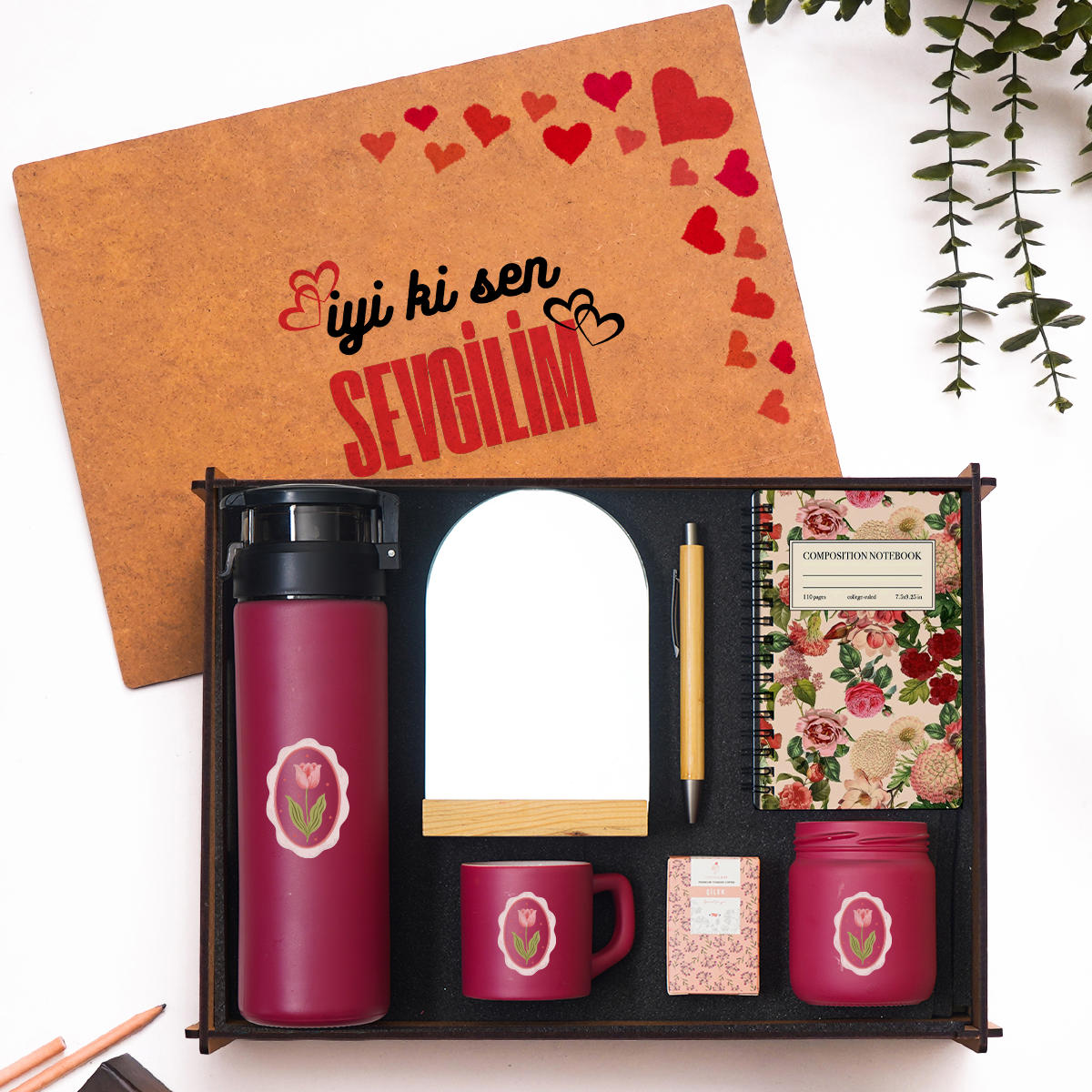 İyi Ki Sen Sevgilim temalı, dekoratif ve sürekli kullanılabilir ahşap kutu içerisinde sunulan bu özel hediye seti; sevginizi şık ve anlamlı bir şekilde ifade etmenizi sağlar.